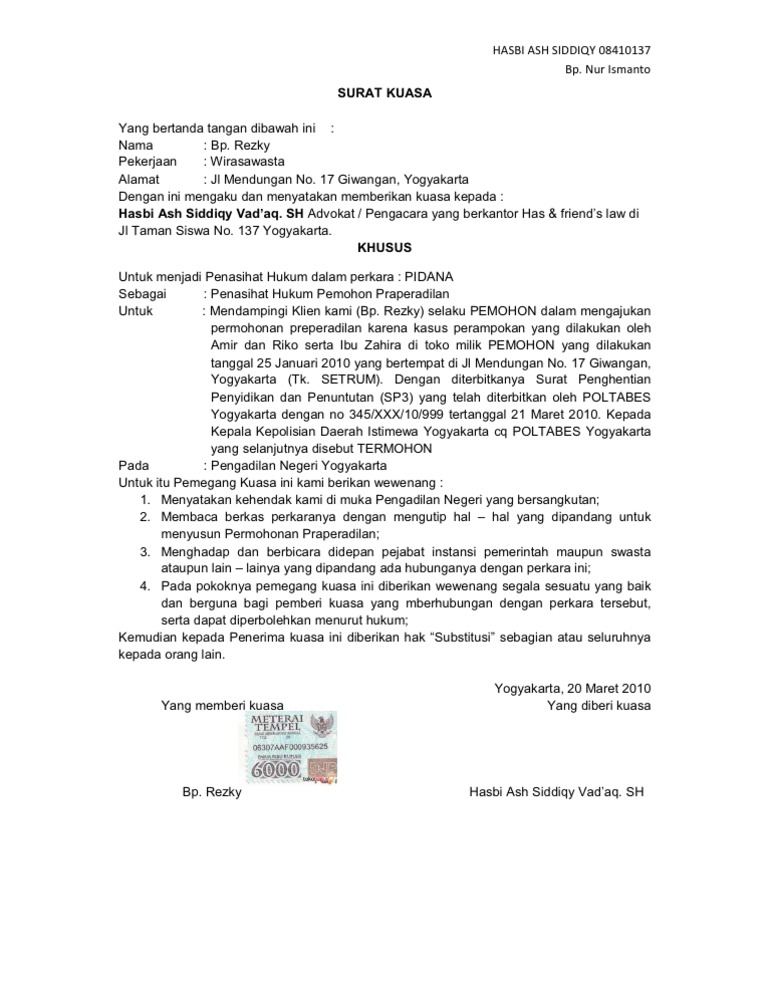 Surat Kuasa Pidana Kempid Fh Unpad from imgv2-1-f.scribdassets.com Demikian surat kuasa khusus ini dibuat untuk dipergunakan sebagaimana mestinya. Download surat kuasa khusus pidana. 18 oktober 1994 bandung, 11 september 2017 penerima kuasa pemberi kuasa totoh wildan tohari,sh eki nurhadi. Untuk maupun atas nama beserta mewakili pemberi kuasa yang dapat mengurus baik pencairan maupun bisa melakukan menerima harta peninggalan dari bca. Personal atau perseorangan, kedinasan, dan khusus atau istimewa. Untuk mendapatkan file contoh surat kuasa khusus advokat yang tidak diproteksi dan bebas untuk diedit, silahkan anda kunjungi situs kami. Mebuat surat kuasa khusus secara lengkap dan mudah yang menyagkut hukum pidanadeskripsi lengkap. Nur azizah, ir binti drs sofyan hadi, 43 tahun, islam, pekerjaan ibu rumah tangga bertempat tinggal di demikian, surat kuasa khusus ini dibuat dengan hak substitusi.